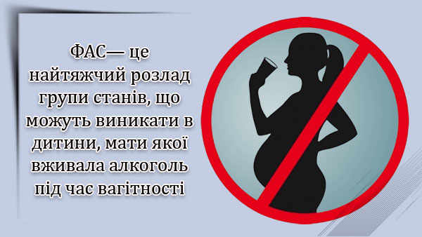 Фетальний алкогольний синдром, або ФАС. Це стан дитини, спричинений впливом алкоголю під час вагітності матері. ФАС може бути причиною пошкодження мозку плода та як наслідок – порушень поведінки, навчання і мислення, а також фізичного розвитку дитини.
