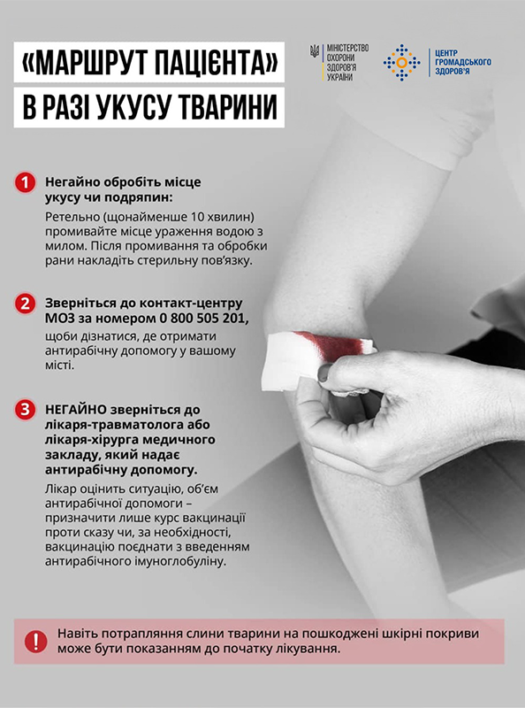Перший крок: якщо вас укусила чи ослинила тварина (дика, безпритульна, домашня тварина незалежно від даних про її вакцинацію) негайно обробіть місце укусу чи подряпин: