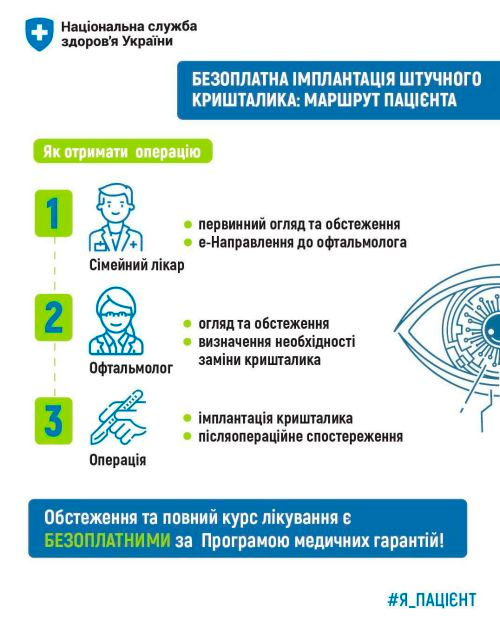Операція із заміни природного кришталика ока на спеціальний штучний імплант проводиться при катаракті — захворюванні, яке поступово погіршує зір та суттєво знижує якість життя людини. Така операція є безоплатною в межах Програми медичних гарантій.